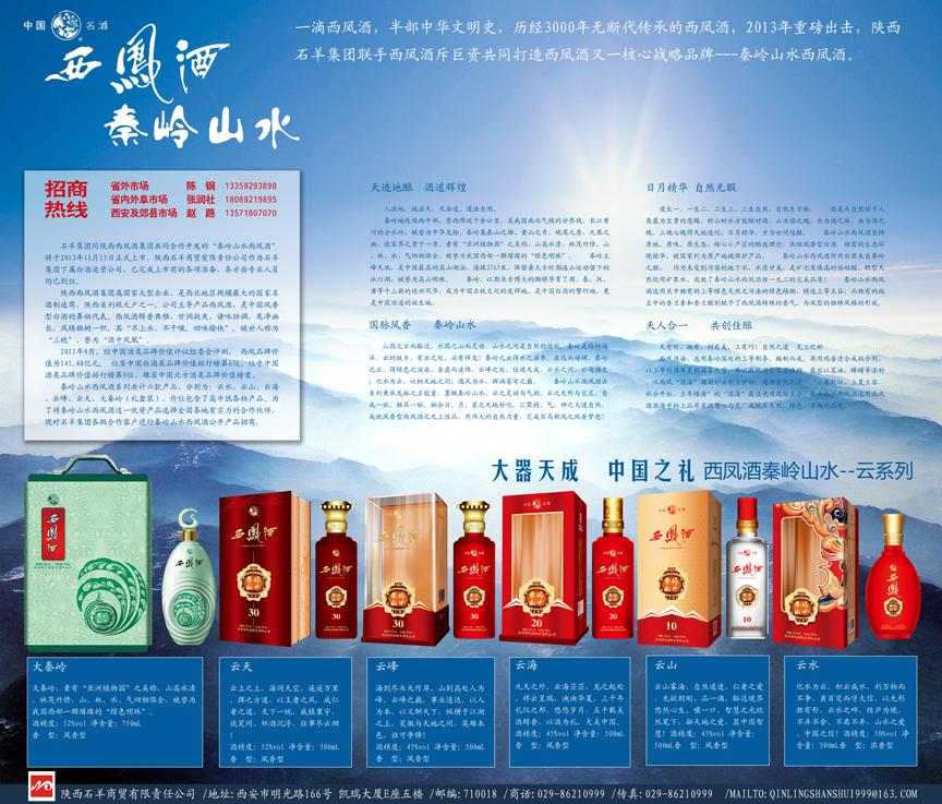 秦岭山水西凤酒系列共计六款产品,分别为:云水、云山、云海、云峰、云天、大秦岭(礼盒装),价位包含了高中低各档产品。为了将秦岭山水西凤酒这一优势产品选择全国各地有实力的合作伙伴,现对米兰MiLan(中国)各级合作客户进行秦岭山水西凤酒公开产品招商,各地有合作意向客户可联系石羊商贸公司以下相关人员。