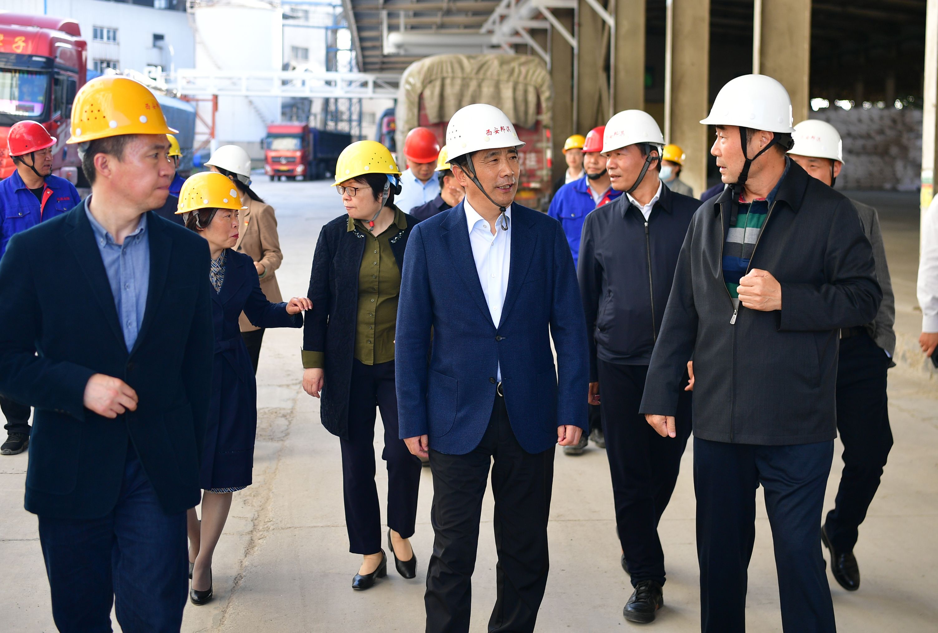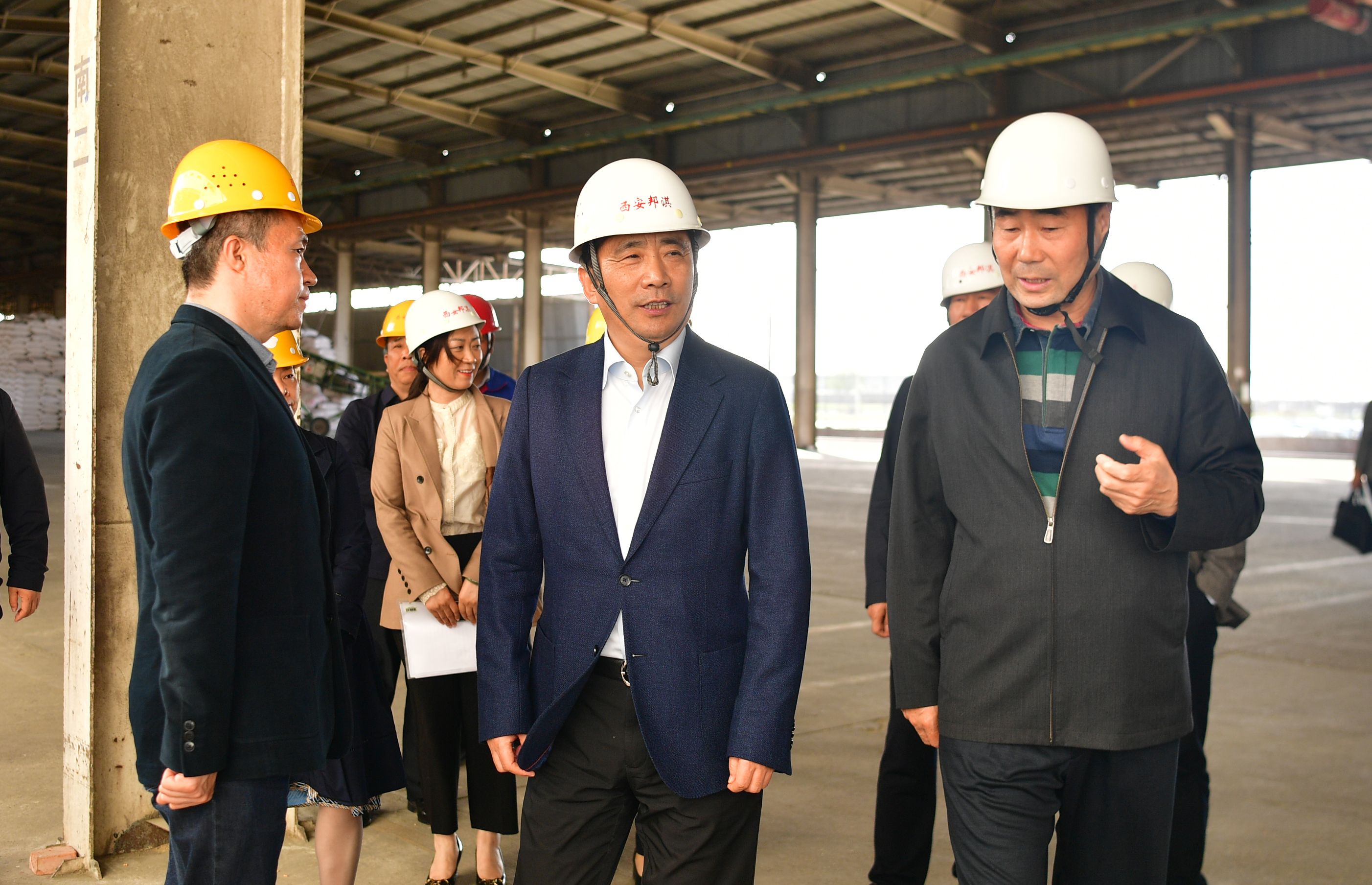 李明远一行来到米兰MiLan(中国)西安邦淇,认真听取了集团党委书记、董事长魏存成关于企业生产经营情况的介绍,观摩了100万吨植物蛋白加工产业项目进展并详细询问原料来源、产品销售、交通物流等情况。
